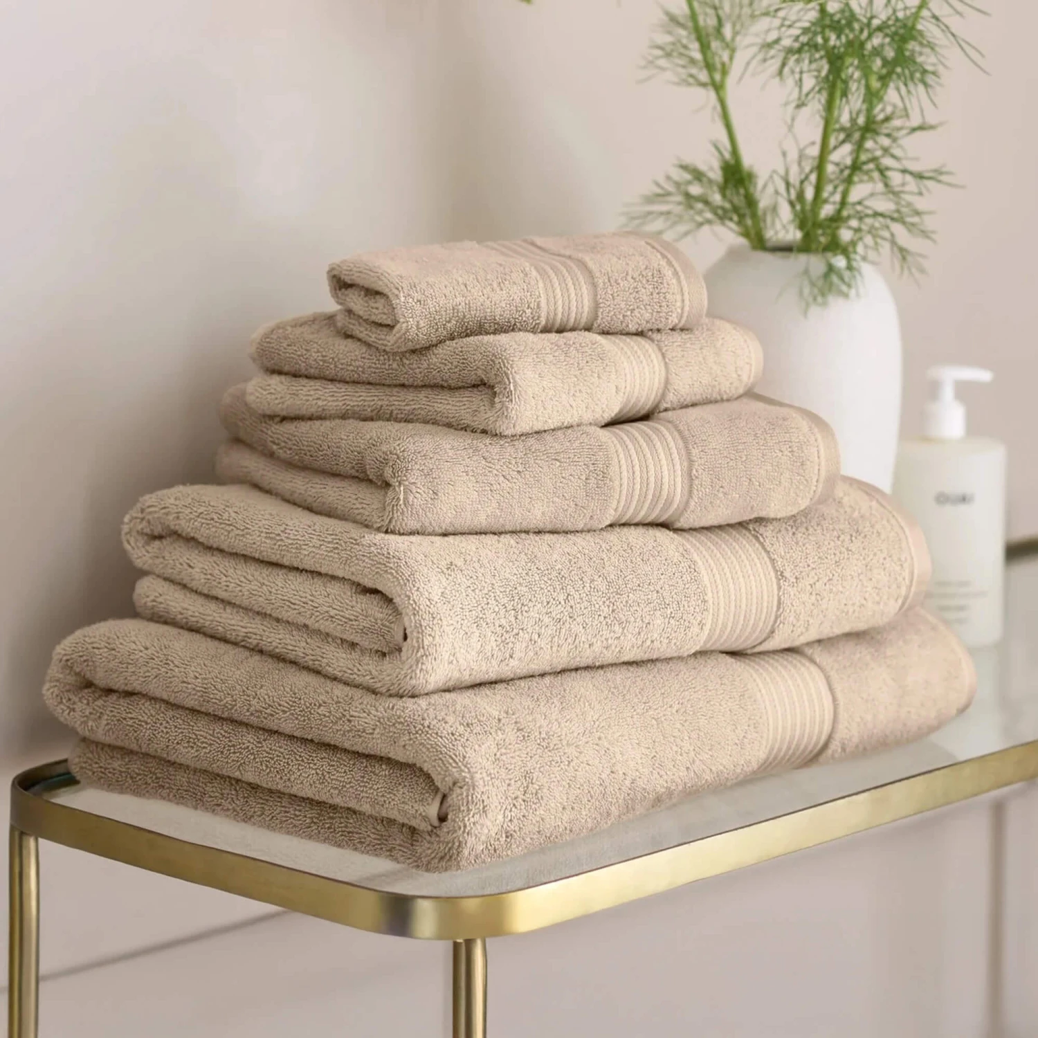 A beige, stone coloured towel made from a thick, soft cotton that makes it super absorbent. The towels features a textured stripe adding a contemporary look.