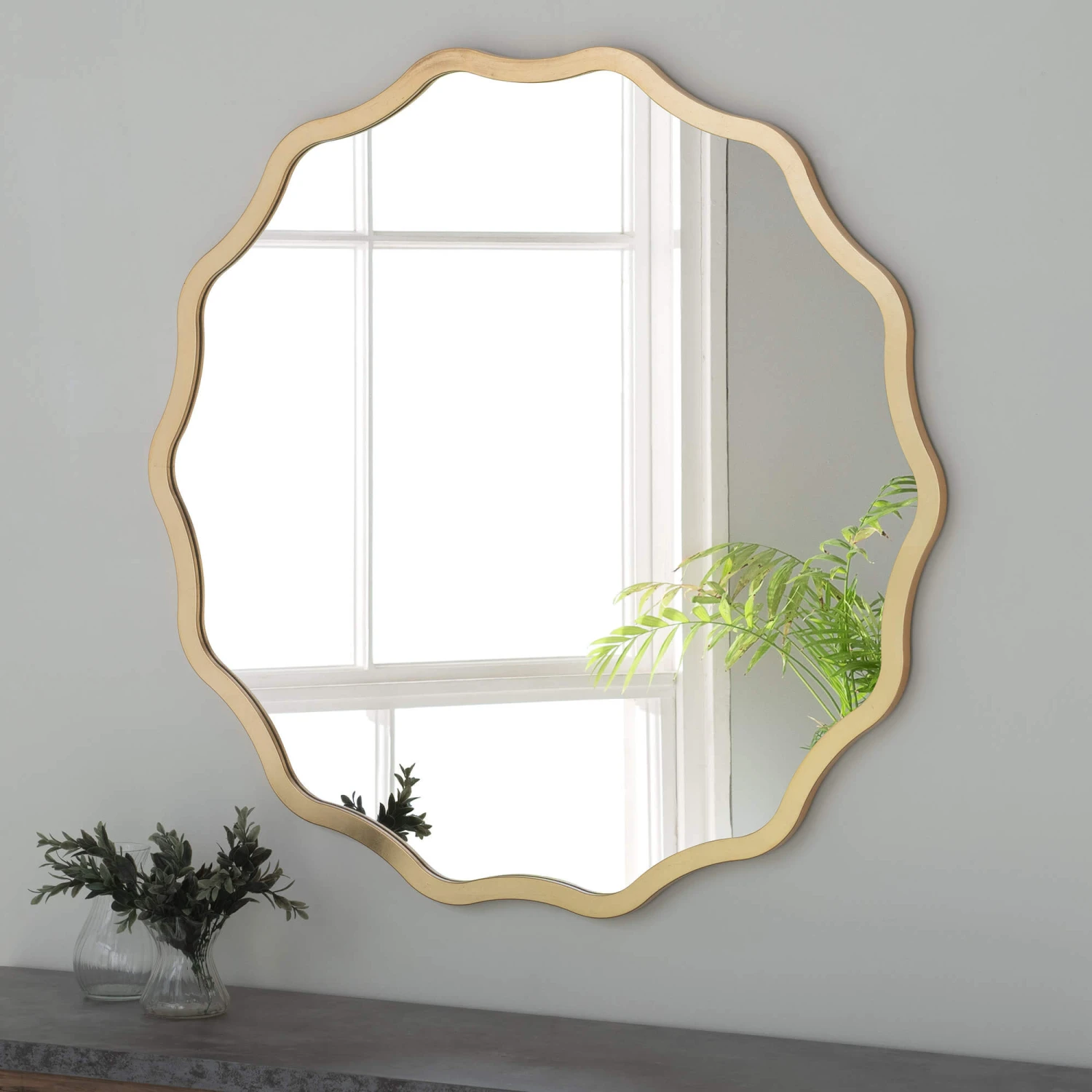 This stunning gold framed 60cm wavy wall mirror, is a captivating piece designed to add a touch of sophistication to any room. The mirror’s unique, organic shape creates a visually interesting focal point, while the gold-toned frame exudes a sense of luxury. With its generous size, this mirror is perfect for reflecting natural light and creating the illusion of a larger space. The mirror glass is wonderfully crisp and reflective, adding utmost light to your interior space for an airy feel. Whether you’re looking to enhance your bedroom, living room, or hallway, this versatile mirror is sure to make a statement.