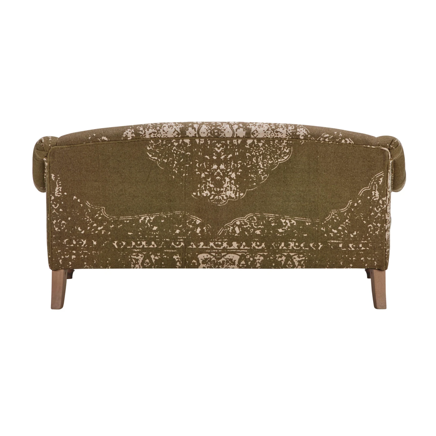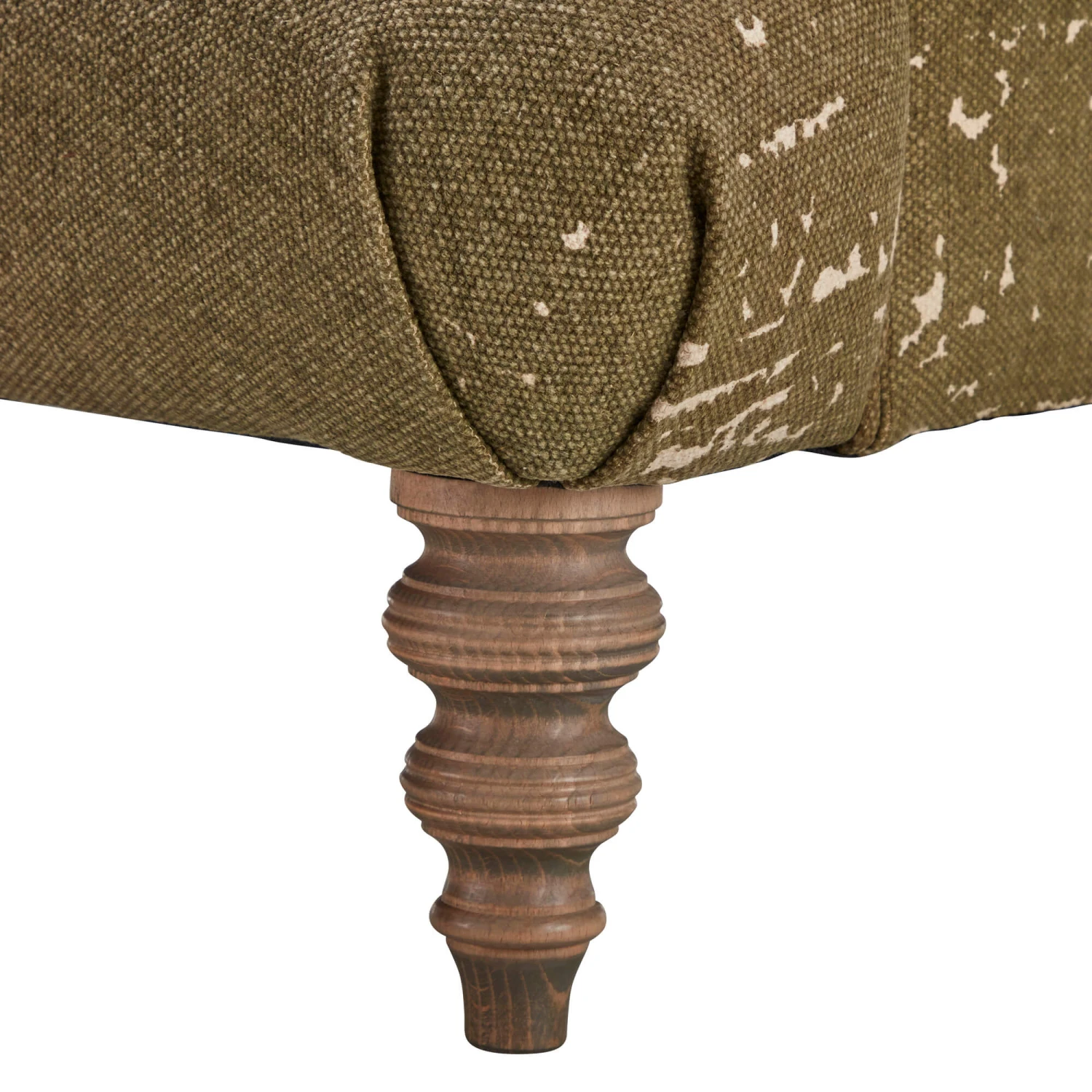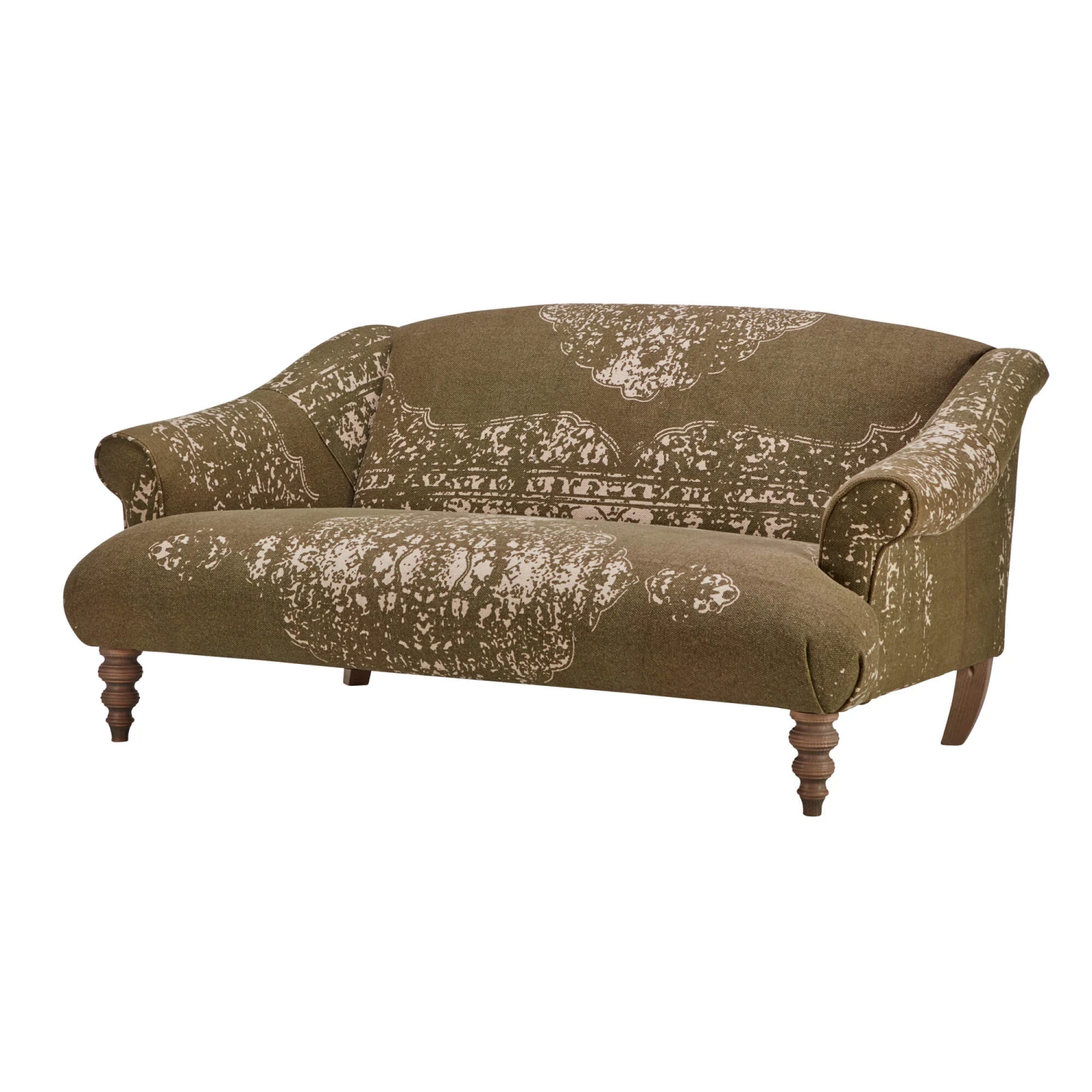 Stylish turned wooden legs in a driftwood finish elevate the sofa and add a touch of organic warmth, creating a beautiful contrast with the khaki green fabric. With its distinctive upholstery and timeless silhouette, this remarkable sofa offers a perfect blend of authentic charm, exceptional comfort and high-quality materials, making it a cherished centrepiece for any living space.