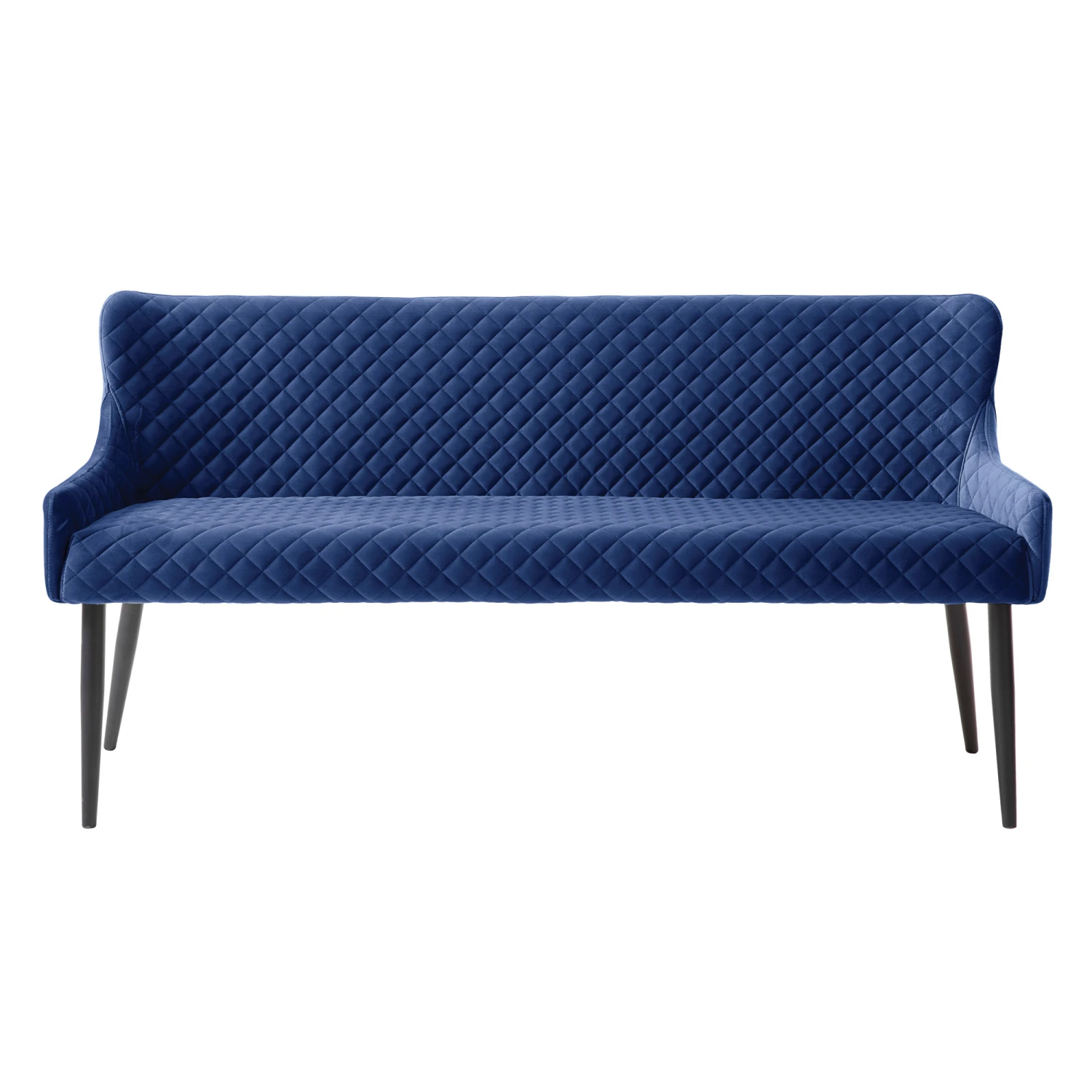 The beautifully proportioned Toby Blue Velvet Dining Sofa Bench creates a more relaxed dining atmosphere whilst perfectly complimenting a range of dining tables and Toby dining chairs. The bench redefines modern chic with its scoop shaped back and cross stitch seats and backrests in a luxurious brushed blue velvet. The bench is supported by four long legs in metal with a black powder coated finish.