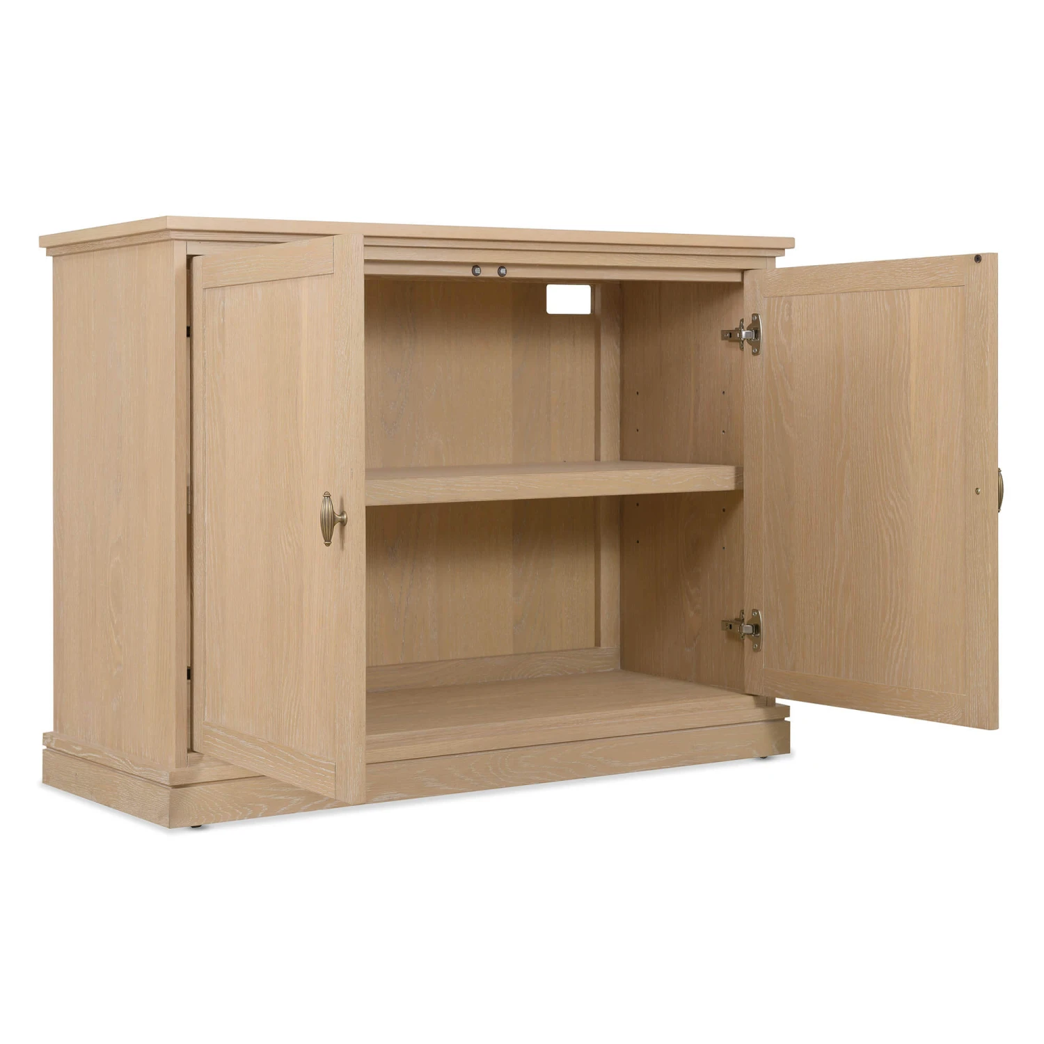 Beyond its captivating exterior, this oak storage unit offers exceptional functionality. Inside, a single, sturdy shelf runs through the middle of the unit, providing organised storage for dinnerware, linens or other items. For modern convenience, an open hole is cleverly positioned at the top right of the unit’s back, ideal for discreetly feeding wires and cables, making it a versatile media storage solution or a perfect spot for kitchen appliances. The entire piece rests on an elevated podium base, adding to its grand presence and offering robust stability.
