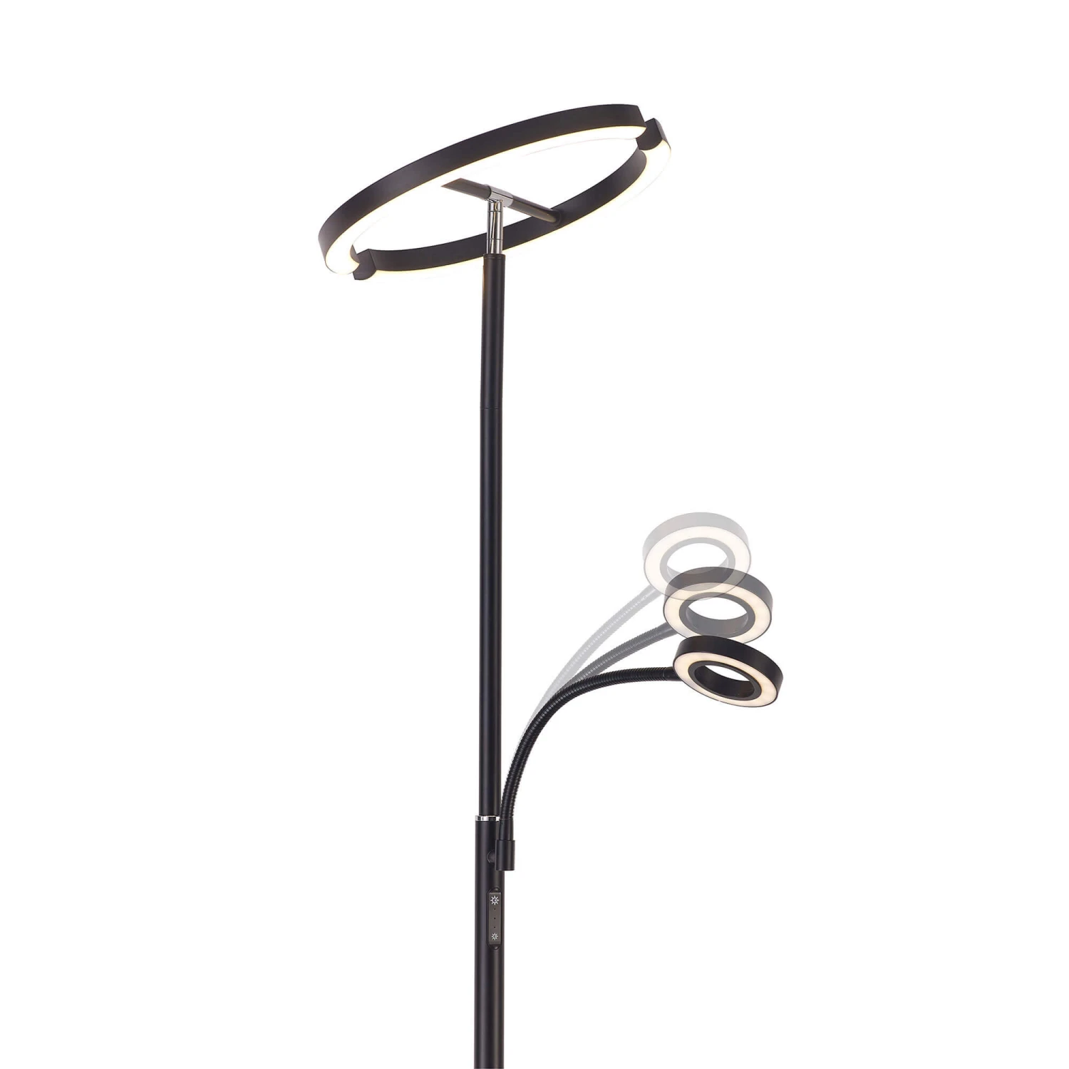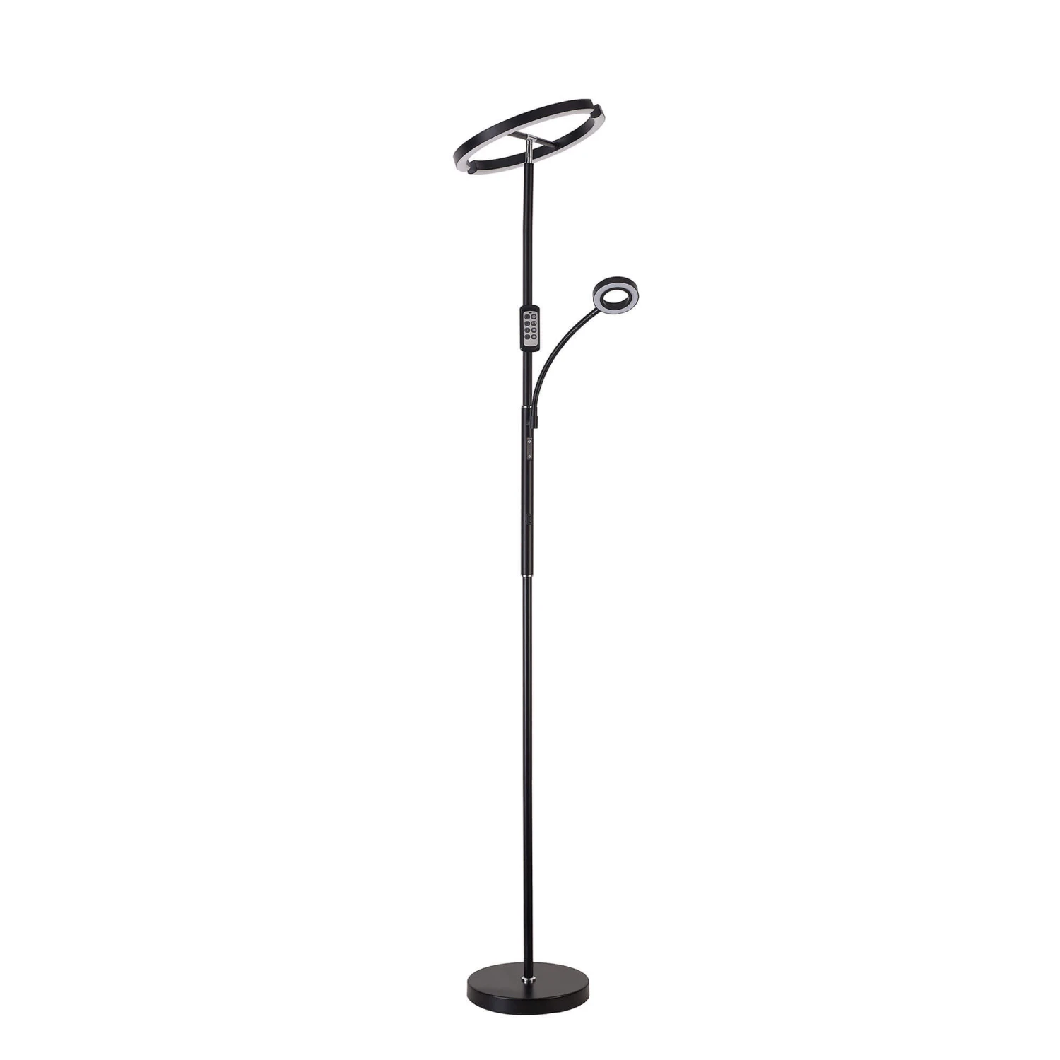 Add a classic yet modernised touch to your home with this Vague Black Uplighter & Reading Light Floor Lamp. Illuminated by two integral LED bulbs, this contemporary floor lamp features two adjustable light sources on a slim stem leading to a main LED uplighter head, with a small halo LED in a form of a reading light sprouting from the centre of the fitting in a black finish. Operated by a touch dimmer or remote control, it allows for easy and convenient adjustment for the brightness or colour temperature of the lamp. Available in two colours; black and dark grey, this versatile and minimalist floor lamp is perfect for illuminating your living room or office.