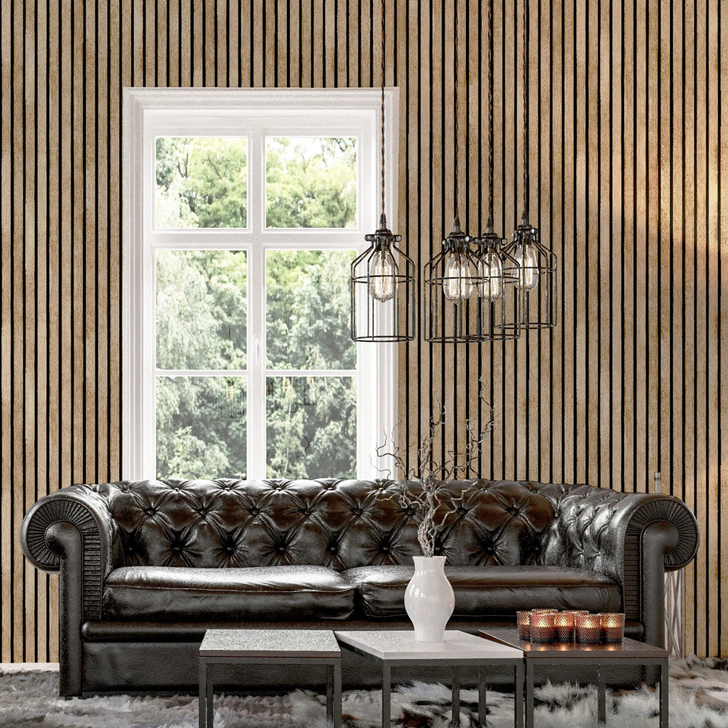 Create a modern and contemporary look with this wooden slat effect wallpaper, featuring a photographic design of wood slats on a dark background, for a rustic and industrial design. Due to its neutral colour palette this wallpaper will compliment any colour palette already in your home.
